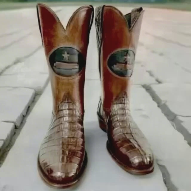 These boots embody the defiant heart of Texas. Built from ‘V’ tail-cut caiman with stitched vamps, they feature oil-tanned tops hand-tooled with the iconic “Come And Take It” flag in a rich, antiqued finish. The result is a bold, unapologetic statement — in your face and unmistakably Texas.