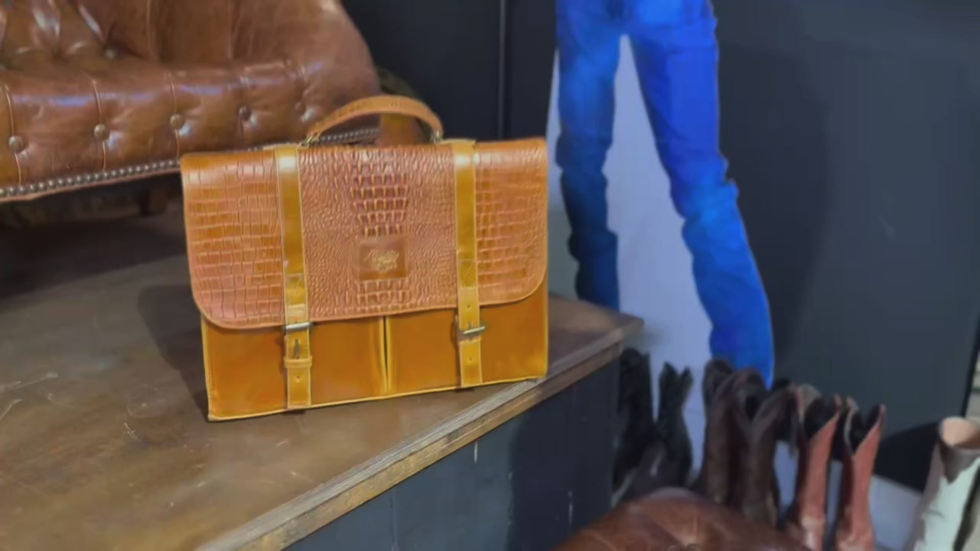 Each bag is artisan-built with precision stitching and care—from the reinforced handles to the durable brass hardware.  There is a hole at the top for the suit hanger to be accessed.